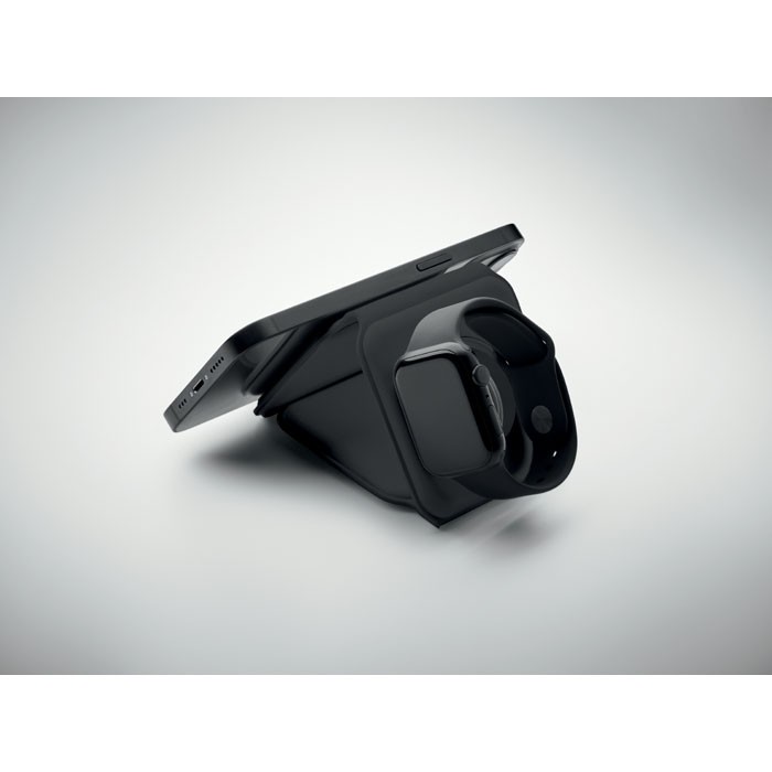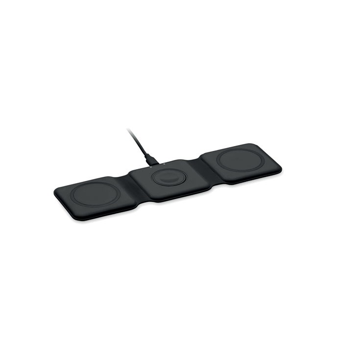 3 in 1 opvouwbaar oplaadstation van ABS. Het heeft 3 draadloze oplaadpunten (15w). Ingang: 2-in-1 Type-C en Type-A.